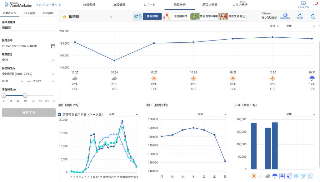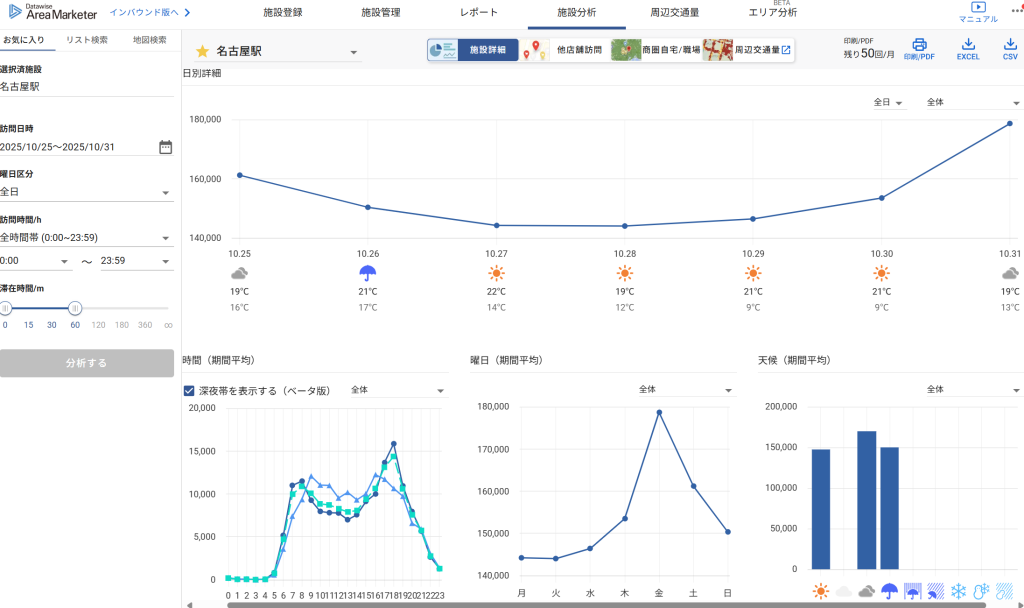来訪属性・時間帯・商圏変動をリアルタイムで把握できます。